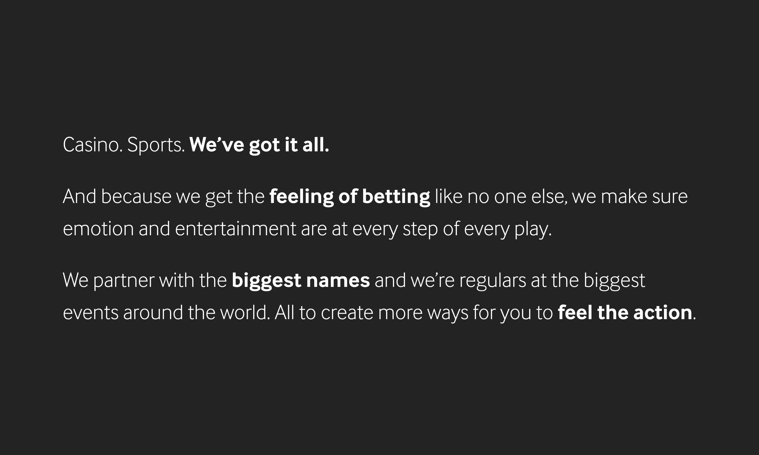 As Global Lead Designer, I helped evolve this into a clear creative platform: “Feel the Action.” A simple but scalable mantra that captured immediacy, atmosphere, and the emotional intensity of live sport. From there, I redesigned the visual brand guidelines to align with this new direction, developing updated systems for typography, colour, motion, and imagery that reflected speed, energy, and proximity to the action.
